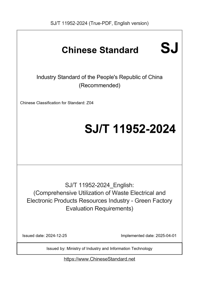 Delivery: <= 4 days. True-PDF full-copy in English will be manually translated and delivered via email. SJ/T 11952-2024: (Comprehensive Utilization of Waste Electrical and Electronic Products Resources Industry - Green Factory Evaluation Requirements) Status: Valid