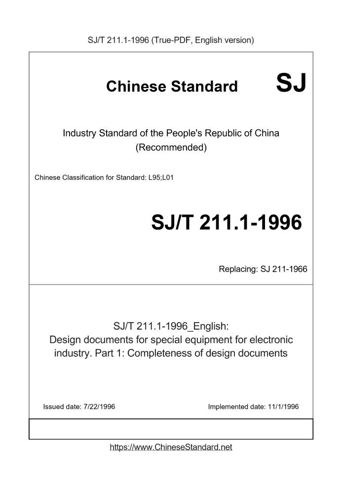 Delivery: <= 2 days. True-PDF full-copy in English will be manually translated and delivered via email. SJ/T 211.1-1996: Design documents for special equipment for electronic industry. Part 1: Completeness of design documents SJ/T 211.1: Historical versions