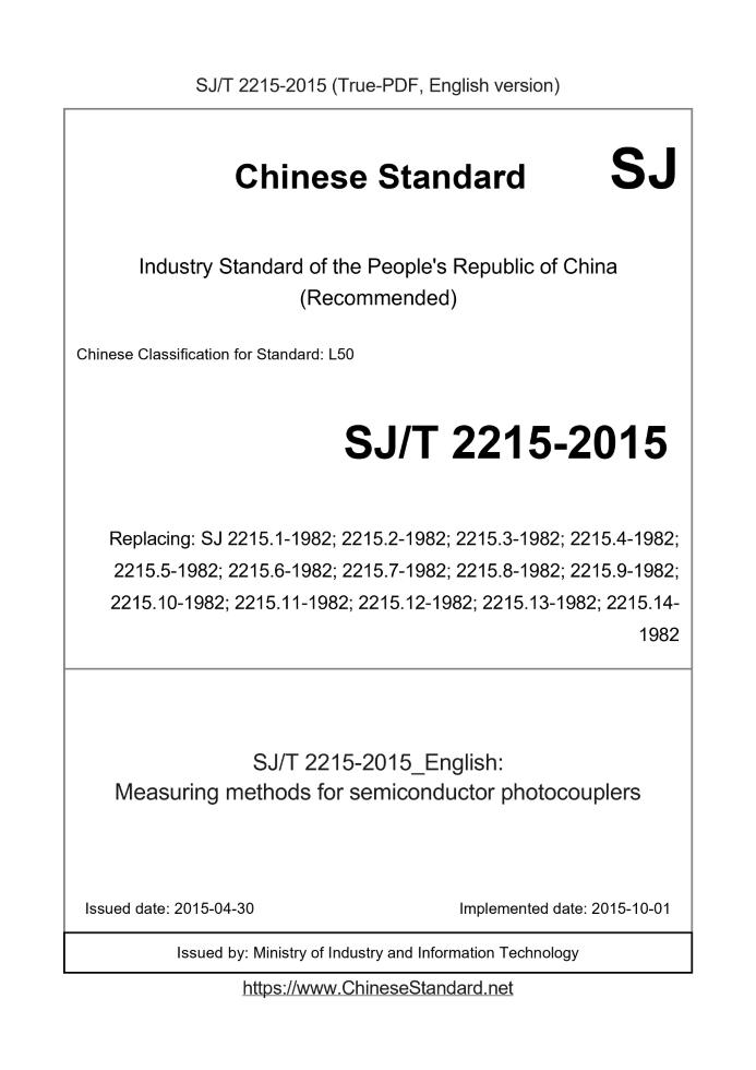 Delivery: <= 6 days. True-PDF full-copy in English will be manually translated and delivered via email. SJ/T 2215-2015: Measuring methods for semiconductor photocouplers Status: Valid SJ/T 2215: Historical versions