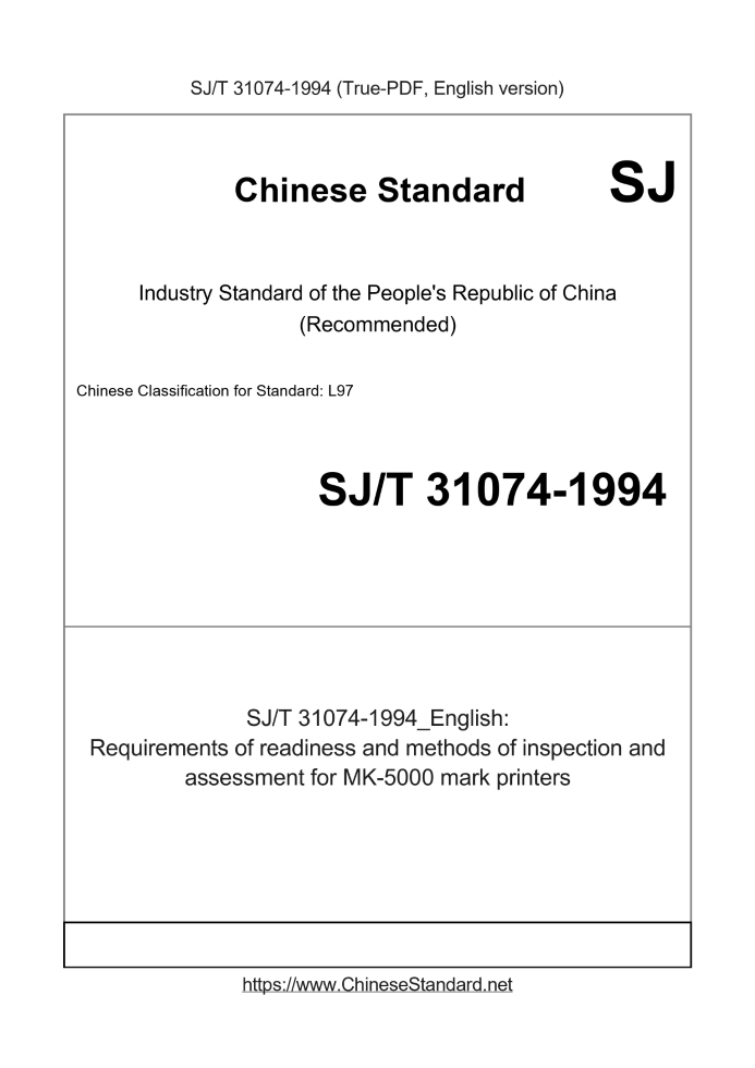 Delivery: <= 2 days. True-PDF full-copy in English will be manually translated and delivered via email. SJ/T 31074-1994: Requirements of readiness and methods of inspection and assessment for MK-5000 mark printers Status: Obsolete