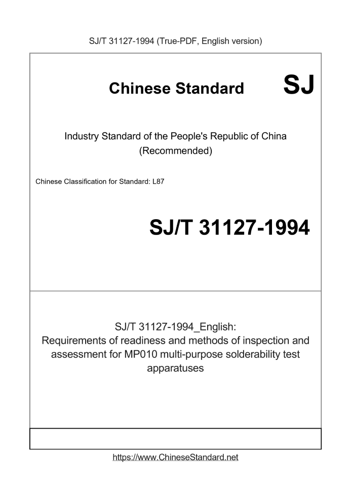 Delivery: <= 2 days. True-PDF full-copy in English will be manually translated and delivered via email. SJ/T 31127-1994: Requirements of readiness and methods of inspection and assessment for MP010 multi-purpose solderability test apparatuses Status: Obsolete