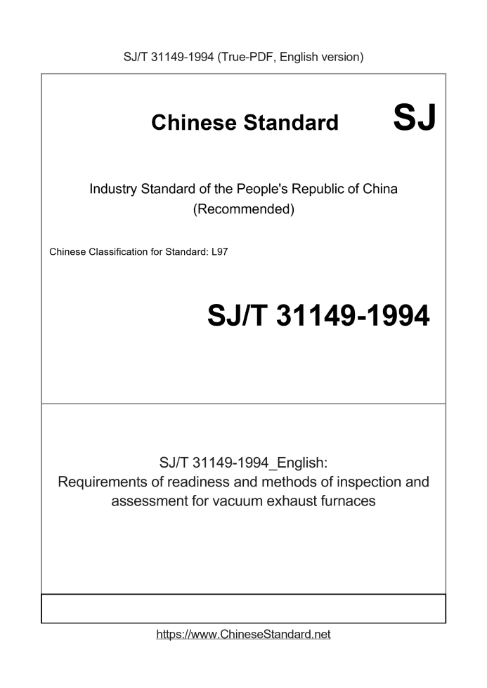 Delivery: <= 2 days. True-PDF full-copy in English will be manually translated and delivered via email. SJ/T 31149-1994: Requirements of readiness and methods of inspection and assessment for vacuum exhaust furnaces Status: Obsolete