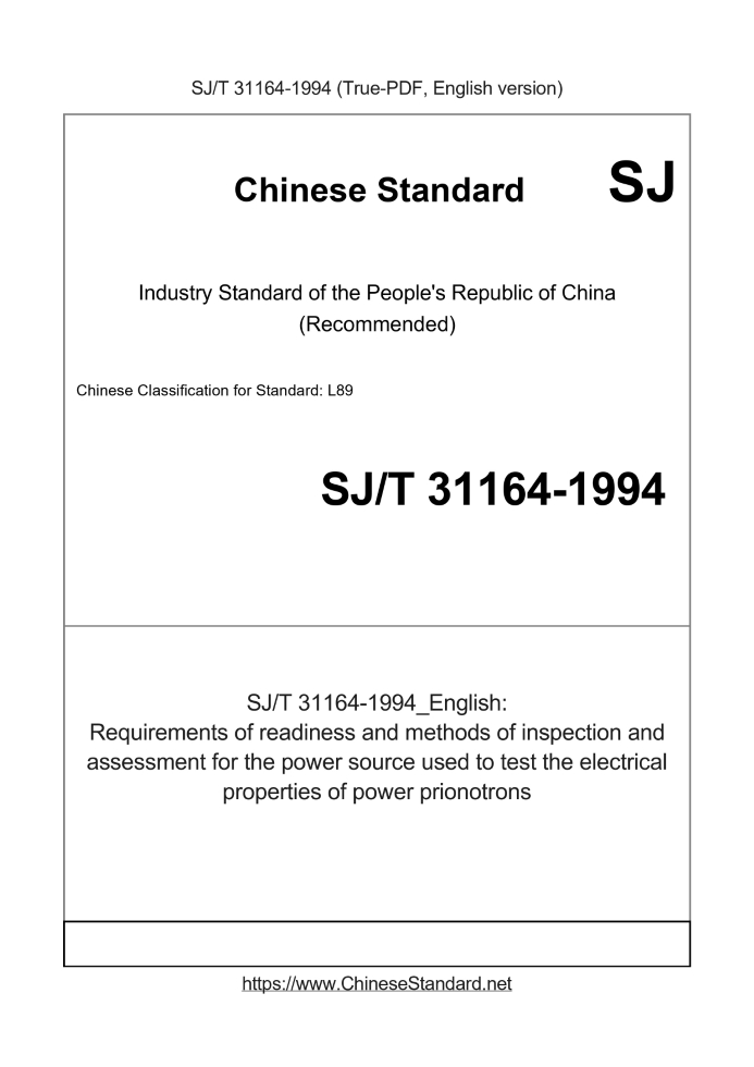 Delivery: <= 2 days. True-PDF full-copy in English will be manually translated and delivered via email. SJ/T 31164-1994: Requirements of readiness and methods of inspection and assessment for the power source used to test the electrical properties of power prionotrons Status: Obsolete