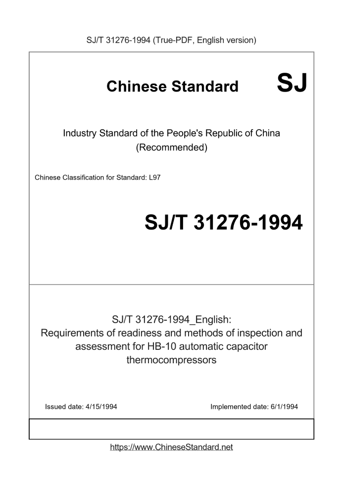 Delivery: <= 2 days. True-PDF full-copy in English will be manually translated and delivered via email. SJ/T 31276-1994: Requirements of readiness and methods of inspection and assessment for HB-10 automatic capacitor thermocompressors Status: Obsolete