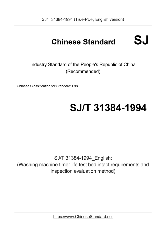 Delivery: <= 2 days. True-PDF full-copy in English will be manually translated and delivered via email. SJ/T 31384-1994: (Washing machine timer life test bed intact requirements and inspection evaluation method) Status: Obsolete