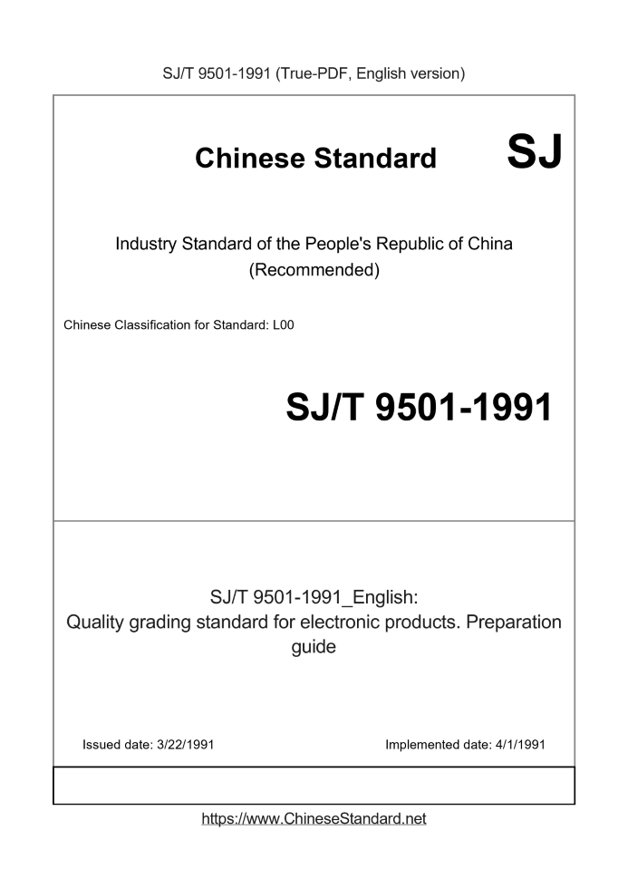 Delivery: <= 3 days. True-PDF full-copy in English will be manually translated and delivered via email. SJ/T 9501-1991: Quality grading standard for electronic products. Preparation guide Status: Obsolete