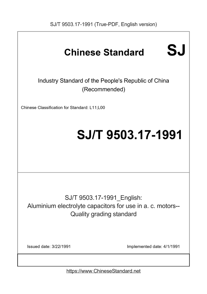 Delivery: <= 2 days. True-PDF full-copy in English will be manually translated and delivered via email. SJ/T 9503.17-1991: Aluminium electrolyte capacitors for use in a. c. motors--Quality grading standard Status: Obsolete