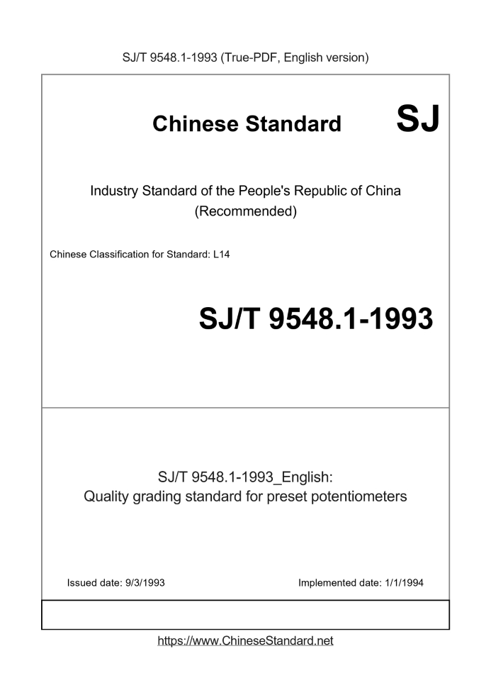 Delivery: <= 2 days. True-PDF full-copy in English will be manually translated and delivered via email. SJ/T 9548.1-1993: Quality grading standard for preset potentiometers Status: Obsolete SJ/T 9548.1: Historical versions