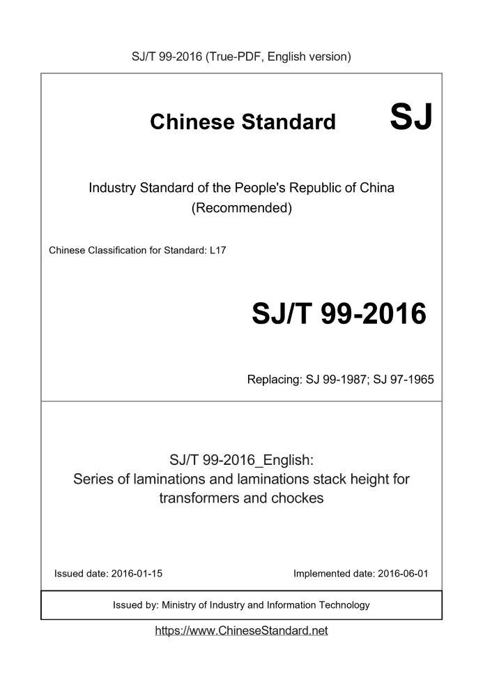 Delivery: <= 5 days. True-PDF full-copy in English will be manually translated and delivered via email. SJ/T 99-2016: Series of laminations and laminations stack height for transformers and chockes Status: Valid SJ/T 99: Historical versions