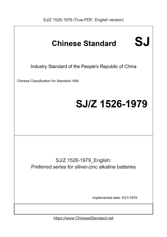 Delivery: <= 6 days. True-PDF full-copy in English will be manually translated and delivered via email. SJZ1526-1979: Preferred series for siliver-zinc alkaline batteries Status: Obsolete