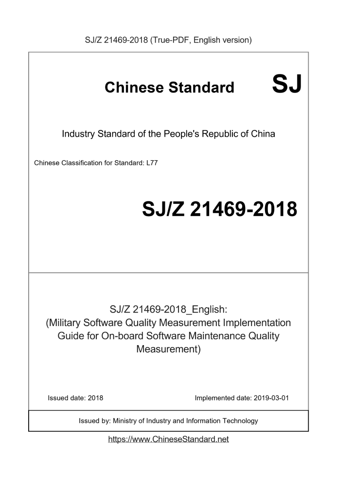 Delivery: <= 4 days. True-PDF full-copy in English will be manually translated and delivered via email. SJZ21469-2018: (Military Software Quality Measurement Implementation Guide for On-board Software Maintenance Quality Measurement)