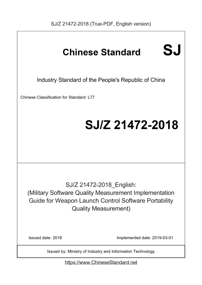 Delivery: <= 5 days. True-PDF full-copy in English will be manually translated and delivered via email. SJZ21472-2018: (Military Software Quality Measurement Implementation Guide for Weapon Launch Control Software Portability Quality Measurement)