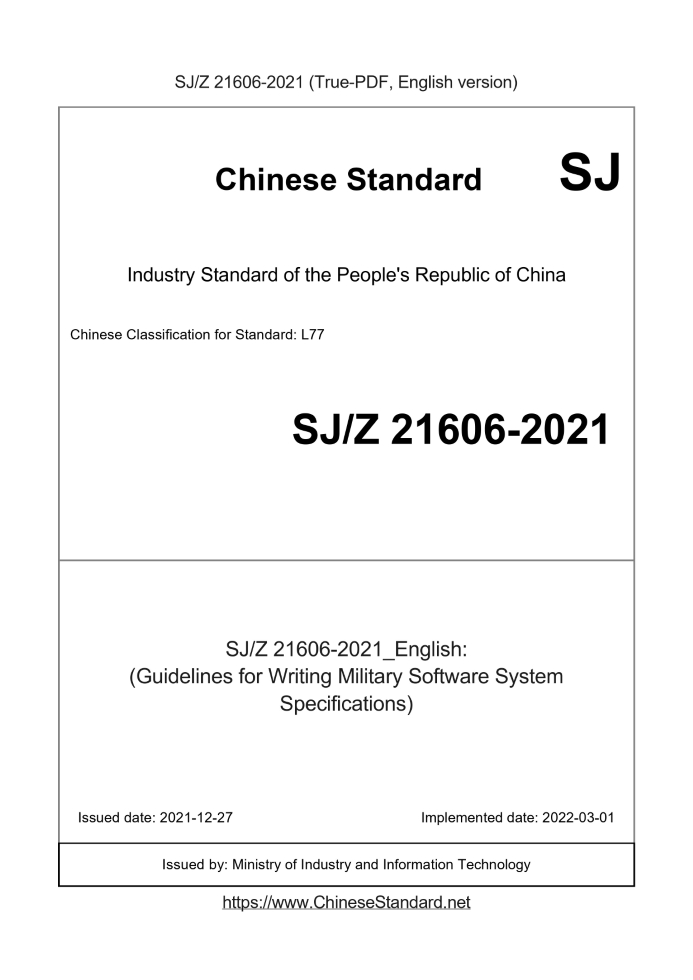 Delivery: <= 6 days. True-PDF full-copy in English will be manually translated and delivered via email. SJZ21606-2021: (Guidelines for Writing Military Software System Specifications) Status: Valid