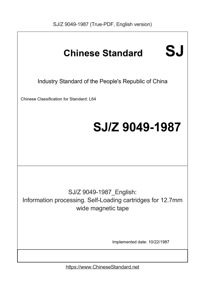 Delivery: <= 3 days. True-PDF full-copy in English will be manually translated and delivered via email. SJZ9049-1987: Information processing. Self-Loading cartridges for 12.7mm wide magnetic tape