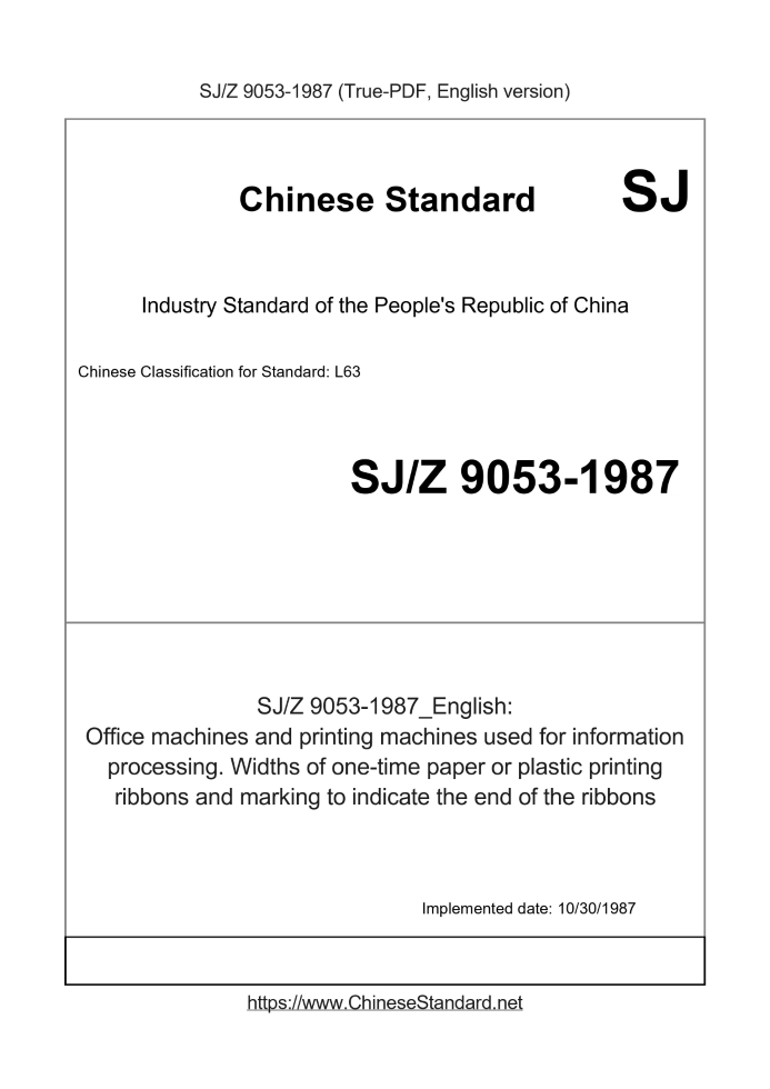 Delivery: <= 3 days. True-PDF full-copy in English will be manually translated and delivered via email. SJZ9053-1987: Office machines and printing machines used for information processing. Widths of one-time paper or plastic printing ribbons and marking to indicate the end of the ribbons