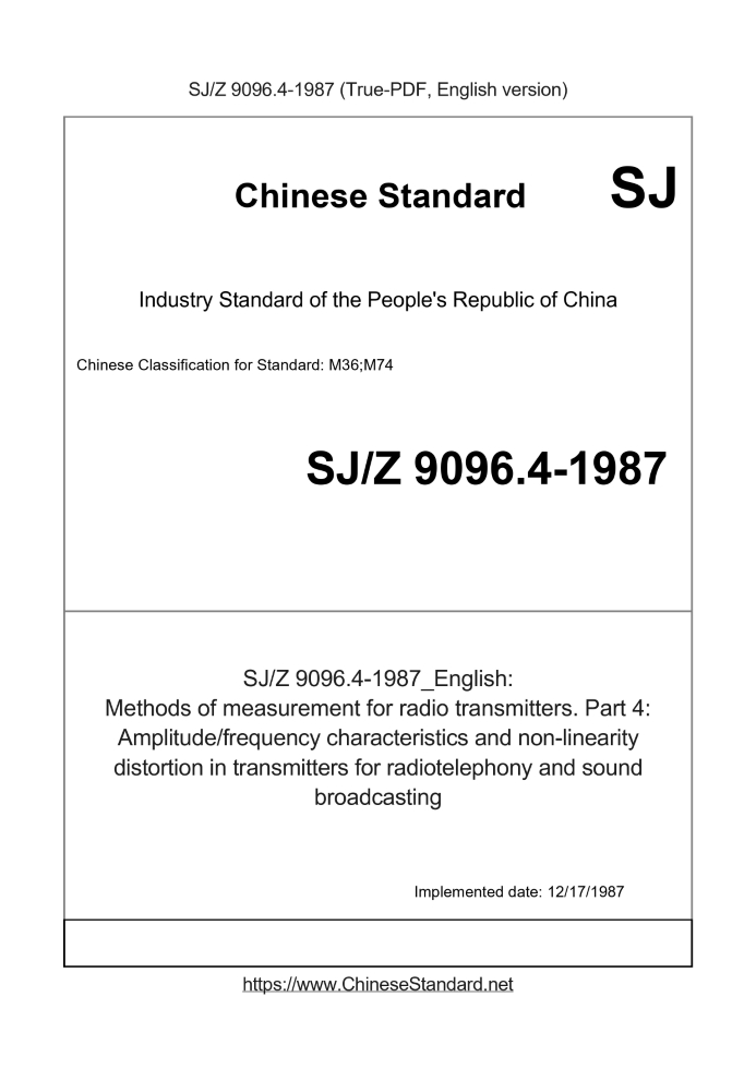 Basic dataStandard ID: SJ/Z 9096.4-1987 (SJ/Z9096.4-1987)Description (Translated English): Methods of measurement for radio transmitters. Part 4: Amplitude/frequency characteristics and non-linearity distortion in transmitters for radiotelephony and sound broadcasting Sector / Industry: Electronics Industry Standard Classification of Chinese Standard: M36;M74 Word Count Estimation: 35,328 Date of Implementation: 12/17/1987 Adopted Standard: IEC 244-4-1973, IDT; IEC 244-4A-1976, IDT Regulation (derived from): Industry-Science (2010) No. 77 Summary: This standard applies to - with a full-carrier wireless telephone or voice broadcast AM transmitter; - has reduced carrier or suppressed carrier single or multiple (up to four) no phone AM engine; - Mono FM broadcast transmitter. In some cases, for the reduction or inhibition of load carrier Phi poured multiplexed voice frequency telegraph AM transmitter is also applicable. Tips & Frequently Asked Questions:Question 1: How long will the true-PDF of SJZ9096.4-1987_English be delivered?Answer: Upon your order, we will start to translate SJZ9096.4-1987_English as soon as possible, and keep you informed of the progress. The lead time is typically 2 ~ 4 working days. The lengthier the document the longer the lead time.Question 2: Can I share the purchased PDF of SJZ9096.4-1987_English with my colleagues?Answer: Yes. The purchased PDF of SJZ9096.4-1987_English will be deemed to be sold to your employer/organization who actually pays for it, including your colleagues and your employer's intranet.Question 3: Does the price include tax/VAT?Answer: Yes. Our tax invoice, downloaded/delivered in 9 seconds, includes all tax/VAT and complies with 100+ countries' tax regulations (tax exempted in 100+ countries) -- See Avoidance of Double Taxation Agreements (DTAs): List of DTAs signed between Singapore and 100+ countriesQuestion 4: Do you accept my currency other than USD?Answer: Yes. If you need your currency to be printed on the invoice, please write an email to Sales@ChineseStandard.net. In 2 working-hours, we will create a special link for you to pay in any currencies. Otherwise, follow the normal steps: Add to Cart -- Checkout -- Select your currency to pay. |