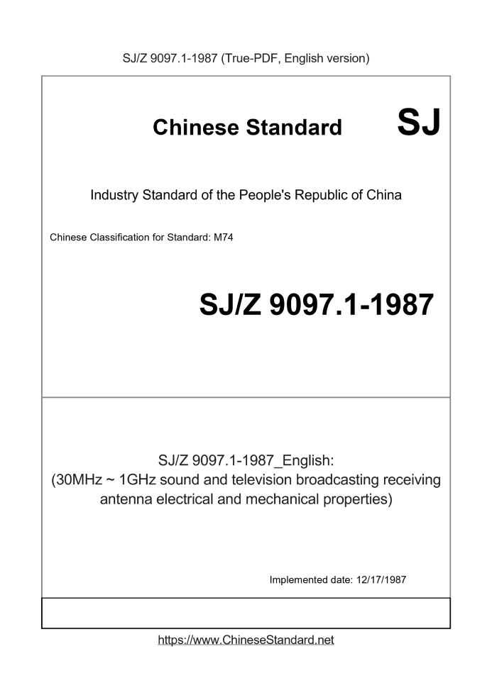 Delivery: <= 3 days. True-PDF full-copy in English will be manually translated and delivered via email. SJZ9097.1-1987: (30MHz ~ 1GHz sound and television broadcasting receiving antenna electrical and mechanical properties) Status: Obsolete