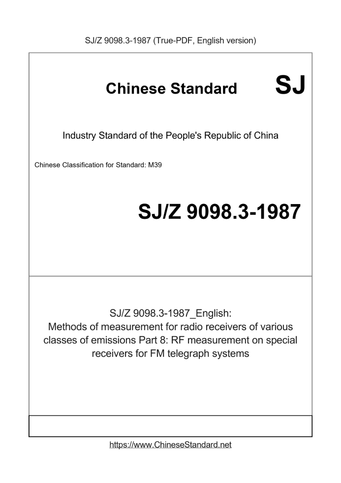 Delivery: <= 3 days. True-PDF full-copy in English will be manually translated and delivered via email. SJZ9098.3-1987: Methods of measurement for radio receivers of various classes of emissions Part 8: RF measurement on special receivers for FM telegraph systems Status: Obsolete
