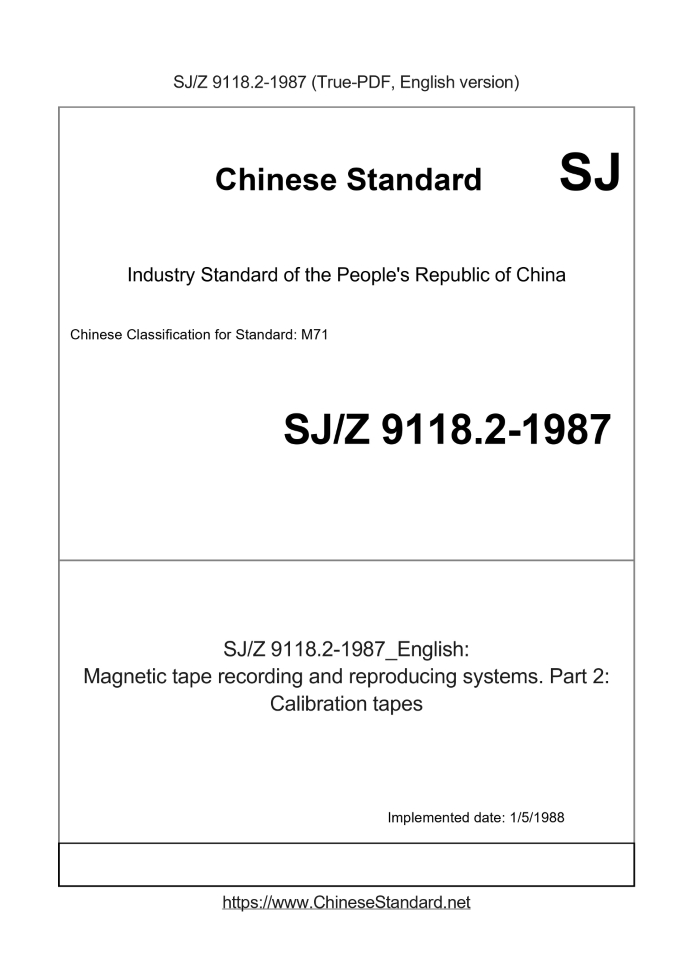 Delivery: <= 3 days. True-PDF full-copy in English will be manually translated and delivered via email. SJZ9118.2-1987: Magnetic tape recording and reproducing systems. Part 2: Calibration tapes