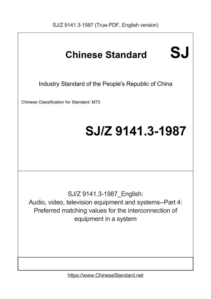 Delivery: <= 3 days. True-PDF full-copy in English will be manually translated and delivered via email. SJZ9141.3-1987: Audio, video, television equipment and systems--Part 4: Preferred matching values for the interconnection of equipment in a system Status: Obsolete