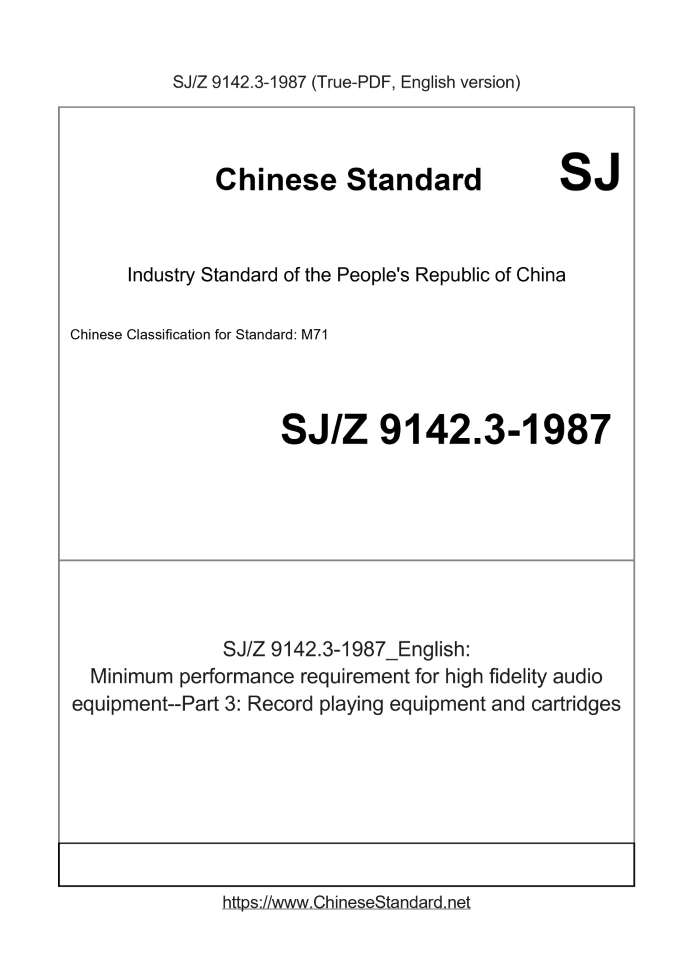 Delivery: <= 3 days. True-PDF full-copy in English will be manually translated and delivered via email. SJZ9142.3-1987: Minimum performance requirement for high fidelity audio equipment--Part 3: Record playing equipment and cartridges Status: Obsolete