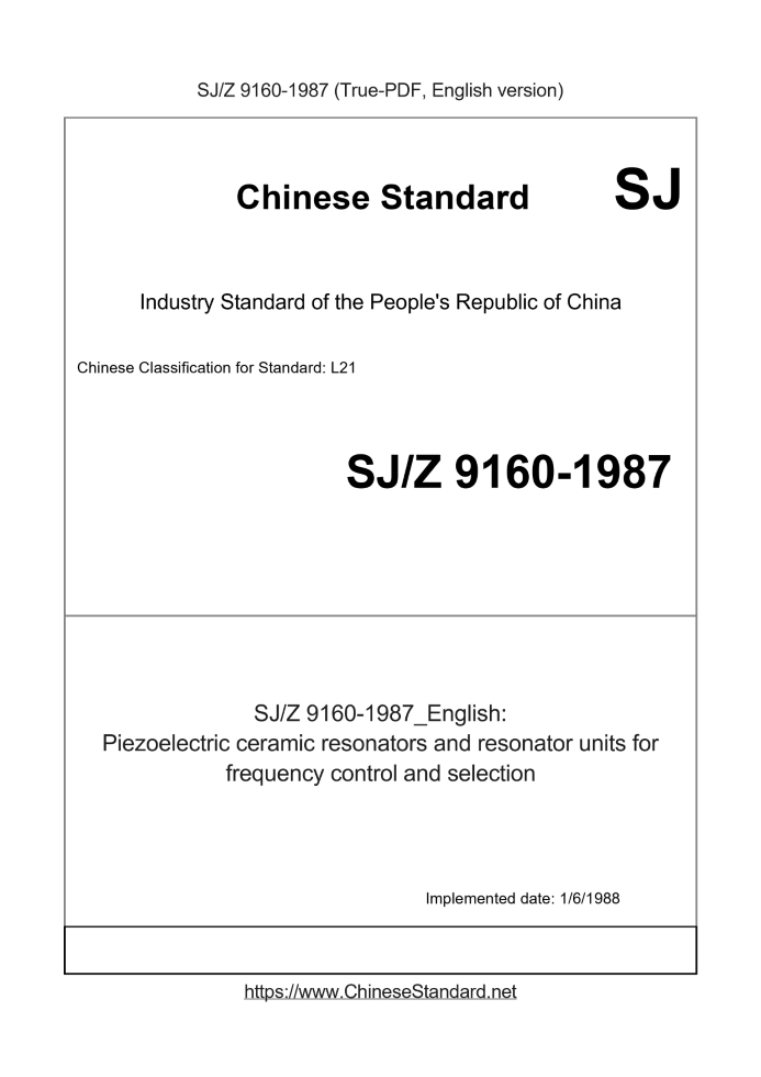 Delivery: <= 3 days. True-PDF full-copy in English will be manually translated and delivered via email. SJZ9160-1987: Piezoelectric ceramic resonators and resonator units for frequency control and selection Status: Obsolete