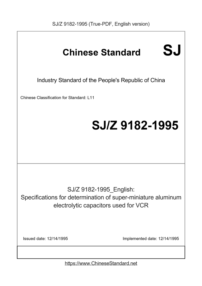 Delivery: <= 3 days. True-PDF full-copy in English will be manually translated and delivered via email. SJZ9182-1995: Specifications for determination of super-miniature aluminum electrolytic capacitors used for VCR Status: Obsolete