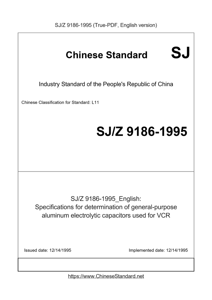 Delivery: <= 4 days. True-PDF full-copy in English will be manually translated and delivered via email. SJZ9186-1995: Specifications for determination of general-purpose aluminum electrolytic capacitors used for VCR Status: Obsolete