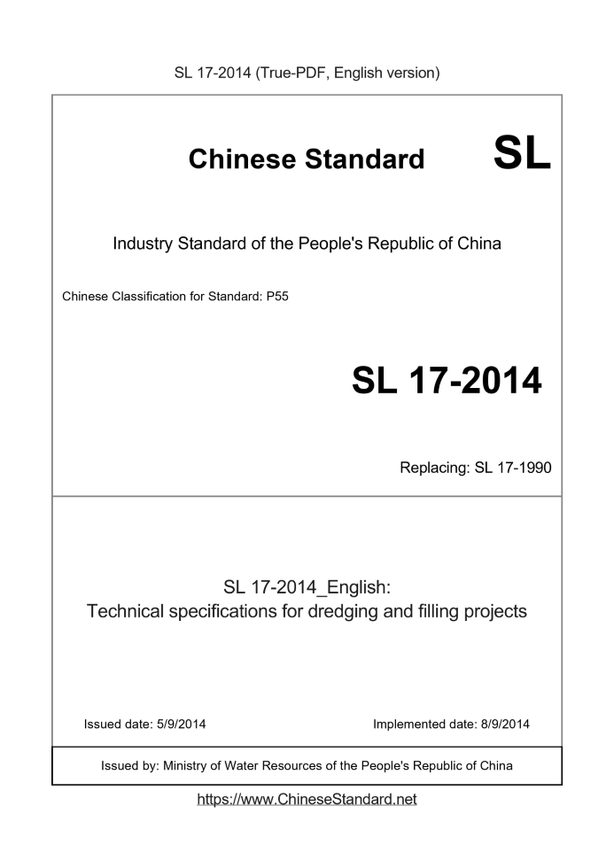 Basic dataStandard ID: SL 17-2014 (SL17-2014)Description (Translated English): Technical specifications for dredging and filling projects Sector / Industry: Water Resources Industry Standard Classification of Chinese Standard: P55 Classification of International Standard: 27.140 Word Count Estimation: 109,195 Date of Issue: 5/9/2014 Date of Implementation: 8/9/2014 Older Standard (superseded by this standard): SL 17-1990 Quoted Standard: GB 4284; GB 8978; GB 15618; GB 16889; GB/T 18314; GB 50021; GB/T 50145; GB 50286; GB 50487; SL 52; SL 176; SL 197; SL 223; SL/T 225; SL 237; SL 278; SL 303; SL 389; SL 398; SL 399; SL 401; SL 631; CJJ 112; HJ 564 Regulation (derived from): 2014 Ministry of Water Resources Bulletin No. 27 Issuing agency(ies): Ministry of Water Resources of the People's Republic of China Summary: This standard applies to rivers, lakes, reservoirs, beaches, canals and other Dredging and Reclamation of mechanical engineering design, construction and quality acceptance. Tips & Frequently Asked Questions:Question 1: How long will the true-PDF of SL 17-2014_English be delivered?Answer: Upon your order, we will start to translate SL 17-2014_English as soon as possible, and keep you informed of the progress. The lead time is typically 1 ~ 3 working days. The lengthier the document the longer the lead time.Question 2: Can I share the purchased PDF of SL 17-2014_English with my colleagues?Answer: Yes. The purchased PDF of SL 17-2014_English will be deemed to be sold to your employer/organization who actually pays for it, including your colleagues and your employer's intranet.Question 3: Does the price include tax/VAT?Answer: Yes. Our tax invoice, downloaded/delivered in 9 seconds, includes all tax/VAT and complies with 100+ countries' tax regulations (tax exempted in 100+ countries) -- See Avoidance of Double Taxation Agreements (DTAs): List of DTAs signed between Singapore and 100+ countriesQuestion 4: Do you accept my currency other than USD?Answer: Yes. If you need your currency to be printed on the invoice, please write an email to Sales@ChineseStandard.net. In 2 working-hours, we will create a special link for you to pay in any currencies. Otherwise, follow the normal steps: Add to Cart -- Checkout -- Select your currency to pay.Question 5: Should I purchase the latest version SL 17-2014?Answer: Yes. Unless special scenarios such as technical constraints or academic study, you should always prioritize to purchase the latest version SL 17-2014 even if the enforcement date is in future. Complying with the latest version means that, by default, it also complies with all the earlier versions, technically. |