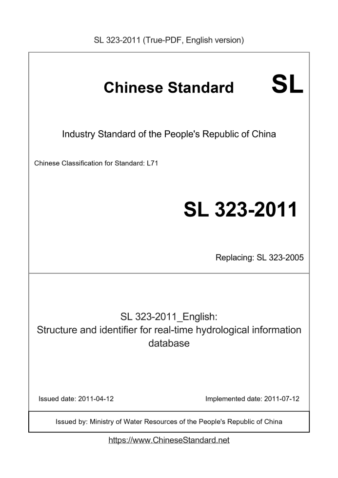 Delivery: <= 13 days. True-PDF full-copy in English will be manually translated and delivered via email. SL 323-2011: Structure and identifier for real-time hydrological information database Status: Valid SL 323: Historical versions