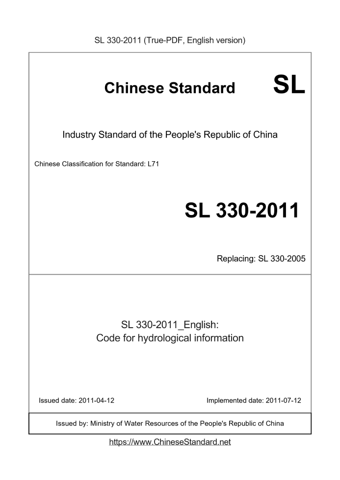 Delivery: <= 10 days. True-PDF full-copy in English will be manually translated and delivered via email. SL 330-2011: Code for hydrological information Status: Valid SL 330: Historical versions