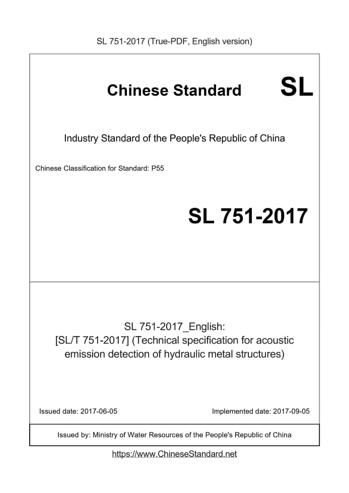 Delivery: <= 4 days. True-PDF full-copy in English will be manually translated and delivered via email. SL 751-2017: [SL/T 751-2017] (Technical specification for acoustic emission detection of hydraulic metal structures) Status: Valid
