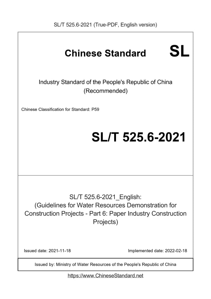 Delivery: <= 8 days. True-PDF full-copy in English will be manually translated and delivered via email. SL/T 525.6-2021: (Guidelines for Water Resources Demonstration for Construction Projects - Part 6: Paper Industry Construction Projects) Status: Valid
