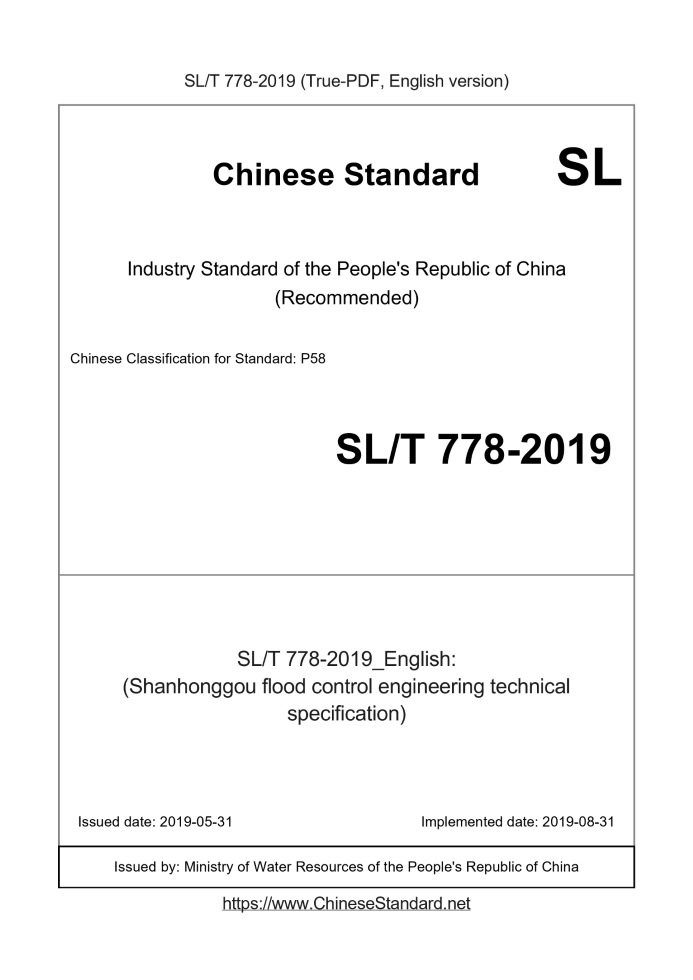 Delivery: <= 7 days. True-PDF full-copy in English will be manually translated and delivered via email. SL/T 778-2019: (Shanhonggou flood control engineering technical specification) Status: Valid
