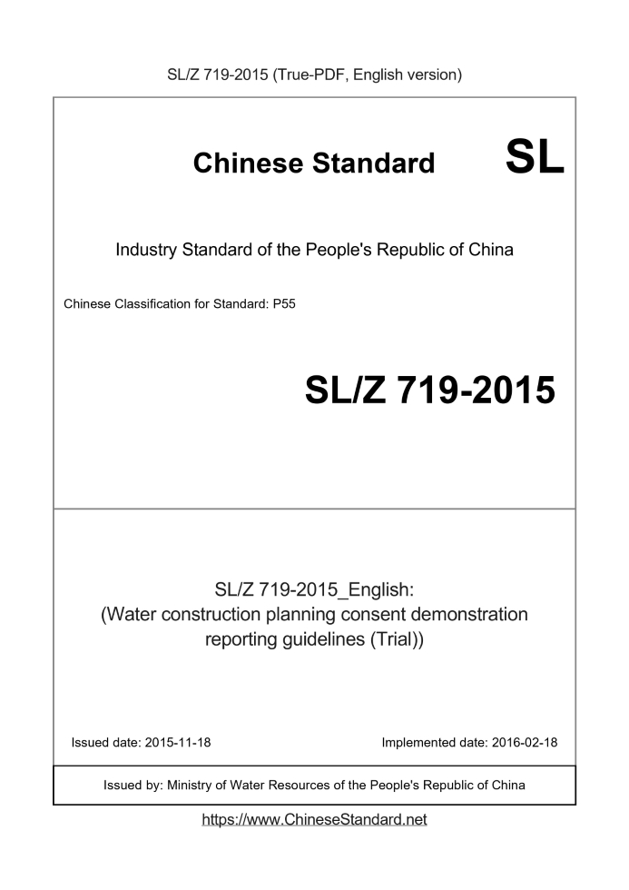 Delivery: <= 4 days. True-PDF full-copy in English will be manually translated and delivered via email. SLZ719-2015: (Water construction planning consent demonstration reporting guidelines (Trial)) Status: Valid