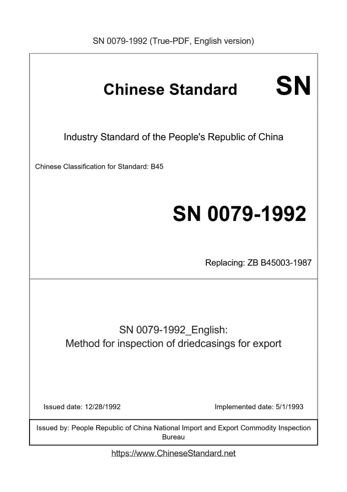 Delivery: <= 2 days. True-PDF full-copy in English will be manually translated and delivered via email. SN 0079-1992: Method for inspection of driedcasings for export Status: Obsolete