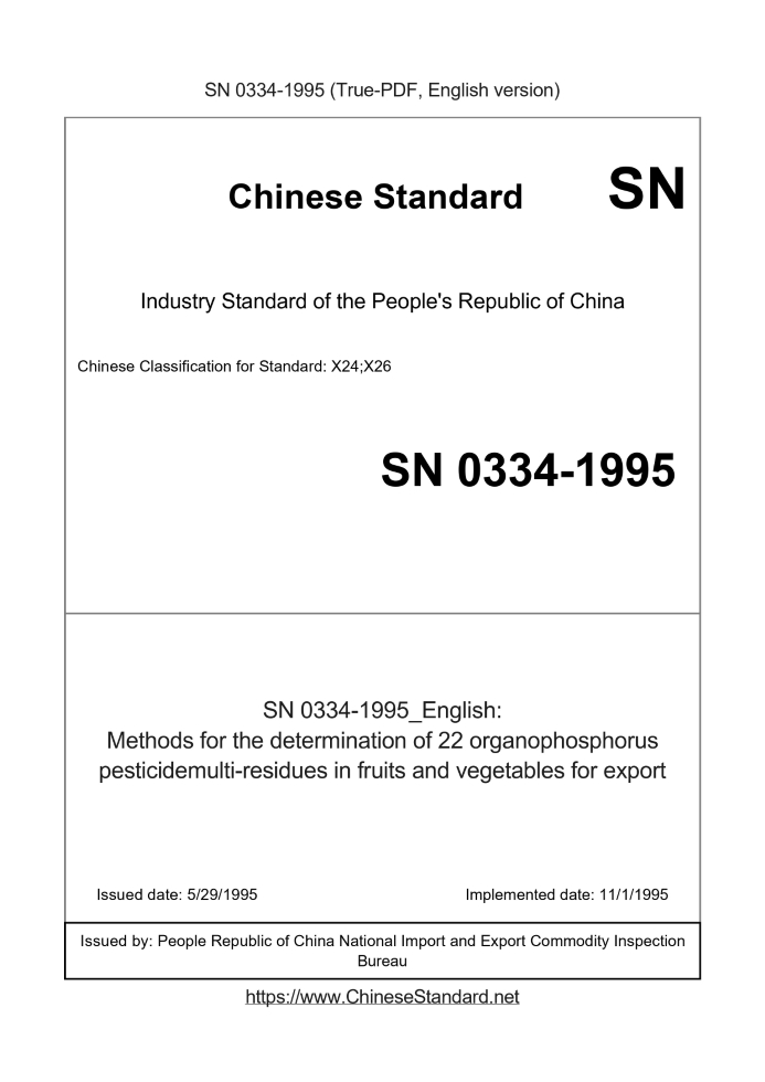 Delivery: <= 4 days. True-PDF full-copy in English will be manually translated and delivered via email. SN 0334-1995: Methods for the determination of 22 organophosphorus pesticidemulti-residues in fruits and vegetables for export Status: Obsolete