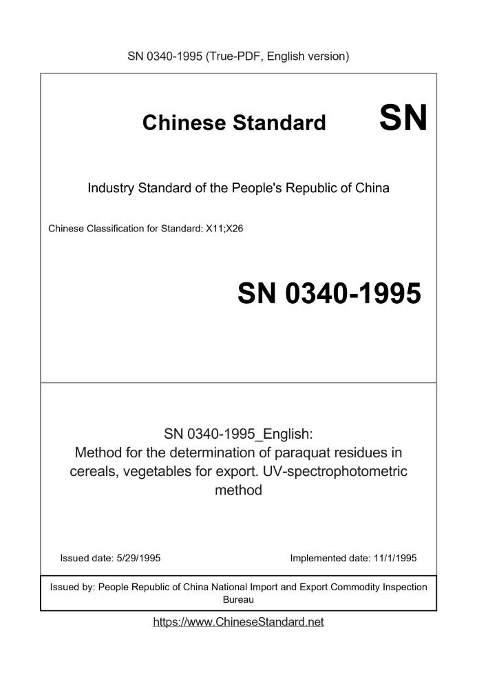 Delivery: <= 4 days. True-PDF full-copy in English will be manually translated and delivered via email. SN 0340-1995: Method for the determination of paraquat residues in cereals, vegetables for export. UV-spectrophotometric method Status: Obsolete