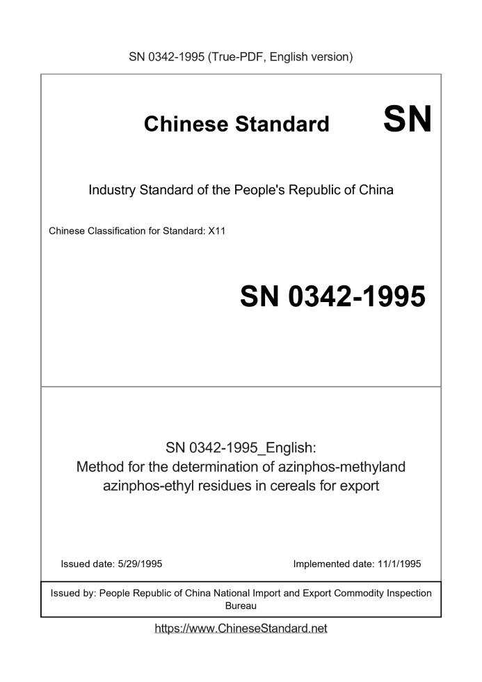 Delivery: <= 4 days. True-PDF full-copy in English will be manually translated and delivered via email. SN 0342-1995: Method for the determination of azinphos-methyland azinphos-ethyl residues in cereals for export Status: Obsolete