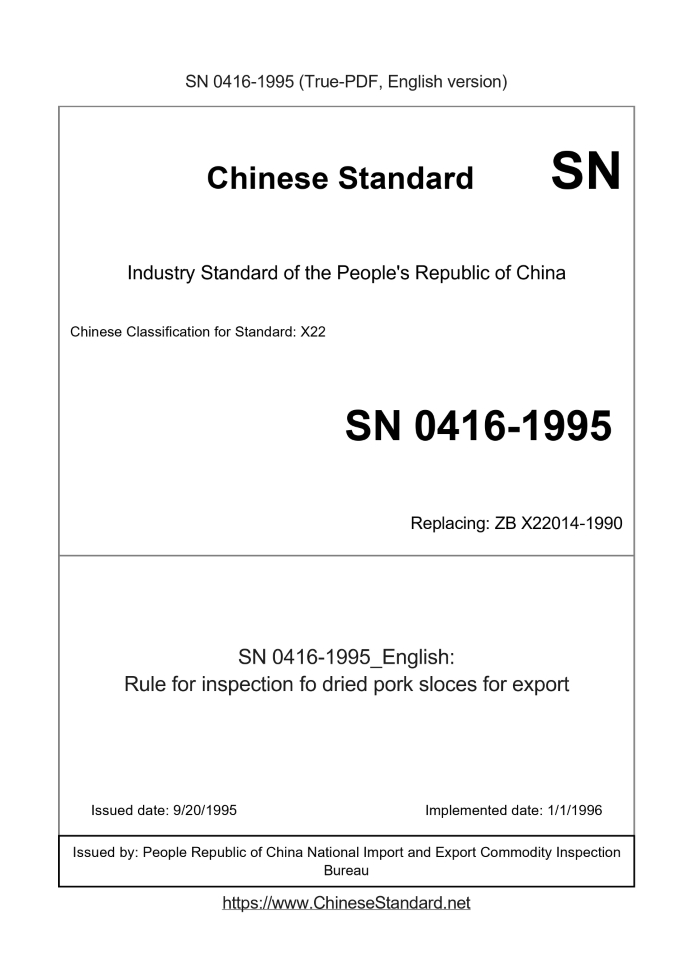Delivery: <= 2 days. True-PDF full-copy in English will be manually translated and delivered via email. SN 0416-1995: Rule for inspection fo dried pork sloces for export Status: Obsolete