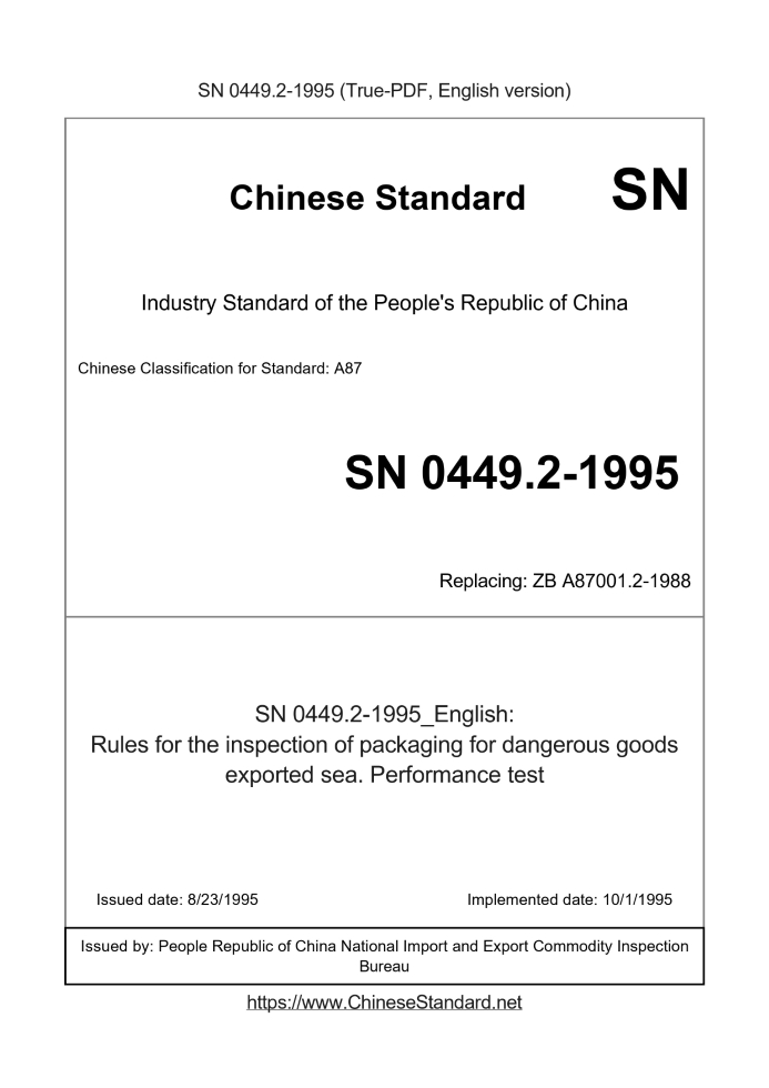 Delivery: <= 4 days. True-PDF full-copy in English will be manually translated and delivered via email. SN 0449.2-1995: Rules for the inspection of packaging for dangerous goods exported sea. Performance test Status: Obsolete