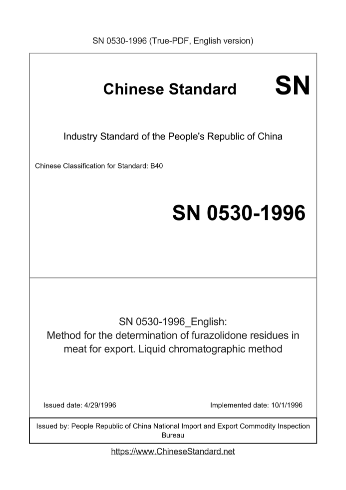 Delivery: <= 4 days. True-PDF full-copy in English will be manually translated and delivered via email. SN 0530-1996: Method for the determination of furazolidone residues in meat for export. Liquid chromatographic method Status: Obsolete