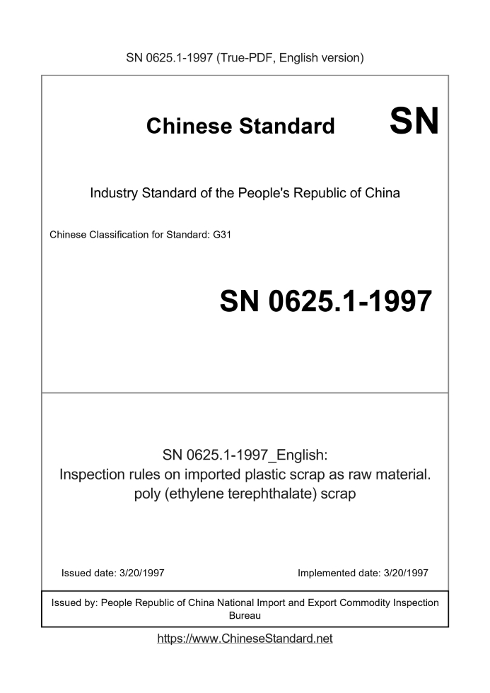 Delivery: <= 2 days. True-PDF full-copy in English will be manually translated and delivered via email. SN 0625.1-1997: Inspection rules on imported plastic scrap as raw material. poly (ethylene terephthalate) scrap Status: Obsolete