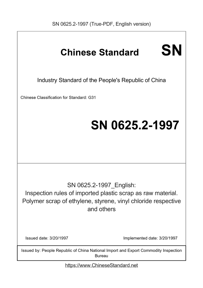 Delivery: <= 2 days. True-PDF full-copy in English will be manually translated and delivered via email. SN 0625.2-1997: Inspection rules of imported plastic scrap as raw material. Polymer scrap of ethylene, styrene, vinyl chloride respective and others Status: Obsolete