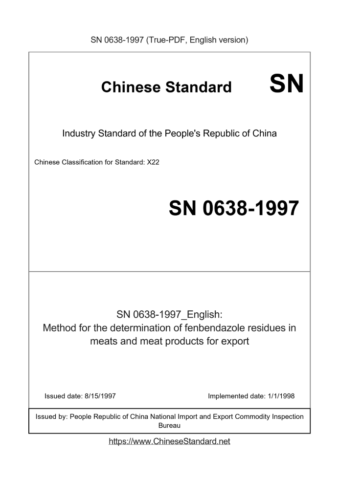 Delivery: <= 3 days. True-PDF full-copy in English will be manually translated and delivered via email. SN 0638-1997: Method for the determination of fenbendazole residues in meats and meat products for export