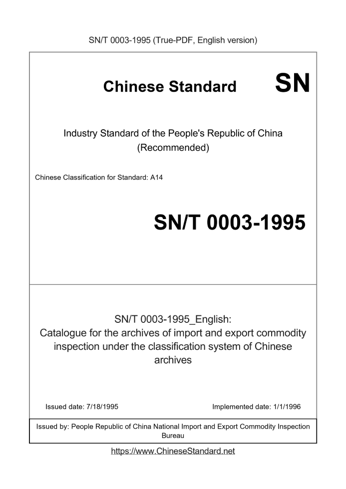 Basic dataStandard ID: SN/T 0003-1995 (SN/T0003-1995)Description (Translated English): Catalogue for the archives of import and export commodity inspection under the classification system of Chinese archives Sector / Industry: Commodity Inspection Standard (Recommended) Classification of Chinese Standard: A14 Word Count Estimation: 30,311 Date of Issue: 7/18/1995 Date of Implementation: 1/1/1996 Issuing agency(ies): People Republic of China National Import and Export Commodity Inspection Bureau Summary: This standard specifies the Import and Export Commodity Inspection File (hereinafter referred to as the inspection file) classification principles, encoding method, architecture, and classification and coding. This standard applies to all types of commodity classification and indexing files. Also applies to certain professional entity files for file sorting and shelving. Tips & Frequently Asked Questions:Question 1: How long will the true-PDF of SN/T 0003-1995_English be delivered?Answer: Upon your order, we will start to translate SN/T 0003-1995_English as soon as possible, and keep you informed of the progress. The lead time is typically 3 ~ 5 working days. The lengthier the document the longer the lead time.Question 2: Can I share the purchased PDF of SN/T 0003-1995_English with my colleagues?Answer: Yes. The purchased PDF of SN/T 0003-1995_English will be deemed to be sold to your employer/organization who actually pays for it, including your colleagues and your employer's intranet.Question 3: Does the price include tax/VAT?Answer: Yes. Our tax invoice, downloaded/delivered in 9 seconds, includes all tax/VAT and complies with 100+ countries' tax regulations (tax exempted in 100+ countries) -- See Avoidance of Double Taxation Agreements (DTAs): List of DTAs signed between Singapore and 100+ countriesQuestion 4: Do you accept my currency other than USD?Answer: Yes. If you need your currency to be printed on the invoice, please write an email to Sales@ChineseStandard.net. In 2 working-hours, we will create a special link for you to pay in any currencies. Otherwise, follow the normal steps: Add to Cart -- Checkout -- Select your currency to pay. |