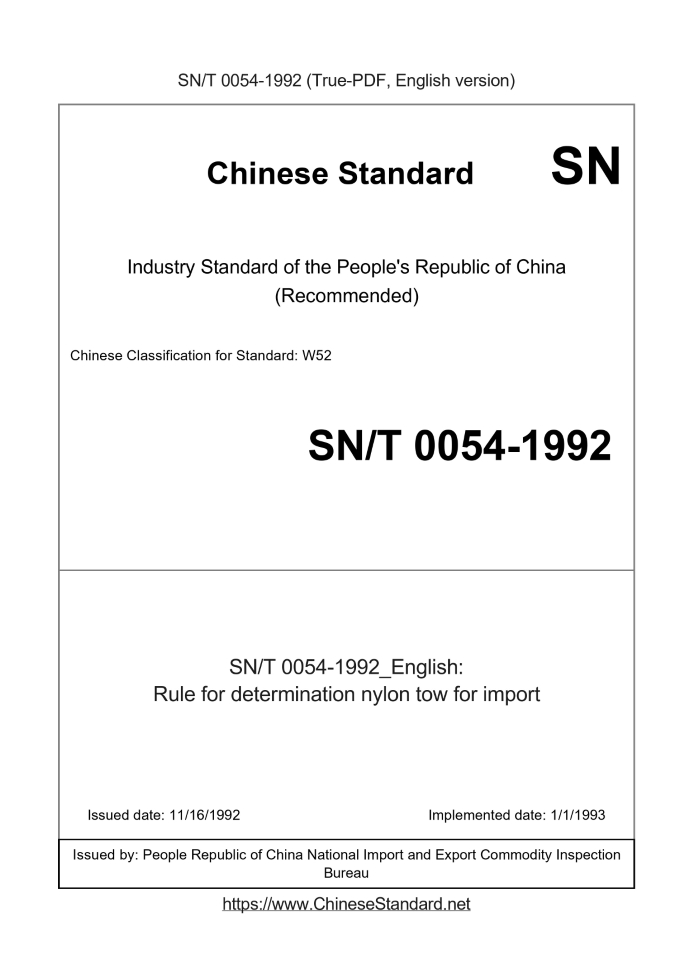 Delivery: <= 3 days. True-PDF full-copy in English will be manually translated and delivered via email. SN/T 0054-1992: Rule for determination nylon tow for import Status: Obsolete