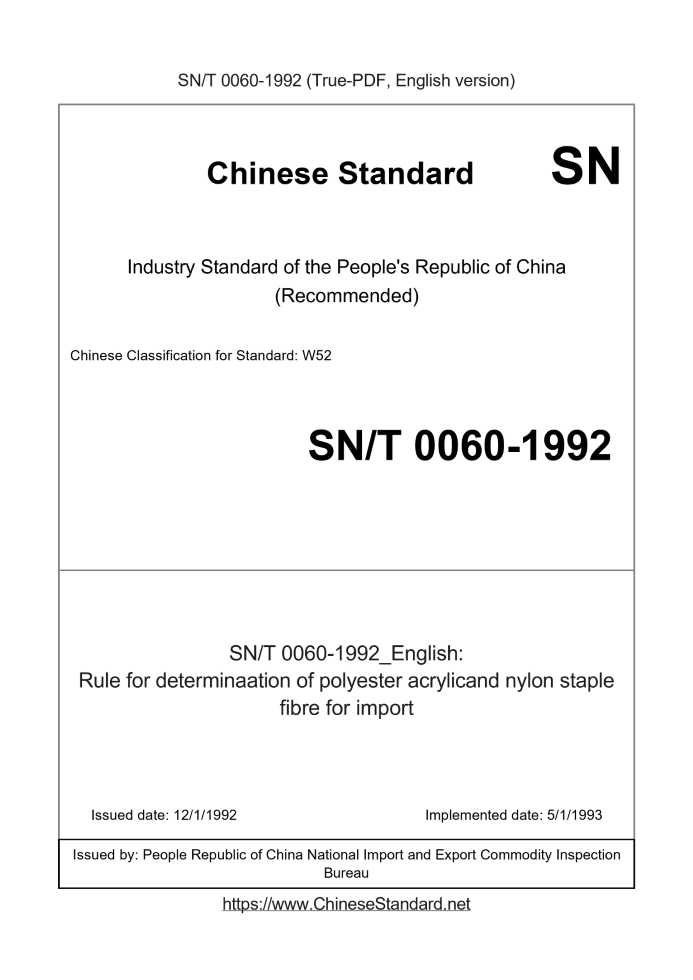 Delivery: <= 4 days. True-PDF full-copy in English will be manually translated and delivered via email. SN/T 0060-1992: Rule for determinaation of polyester acrylicand nylon staple fibre for import Status: Obsolete