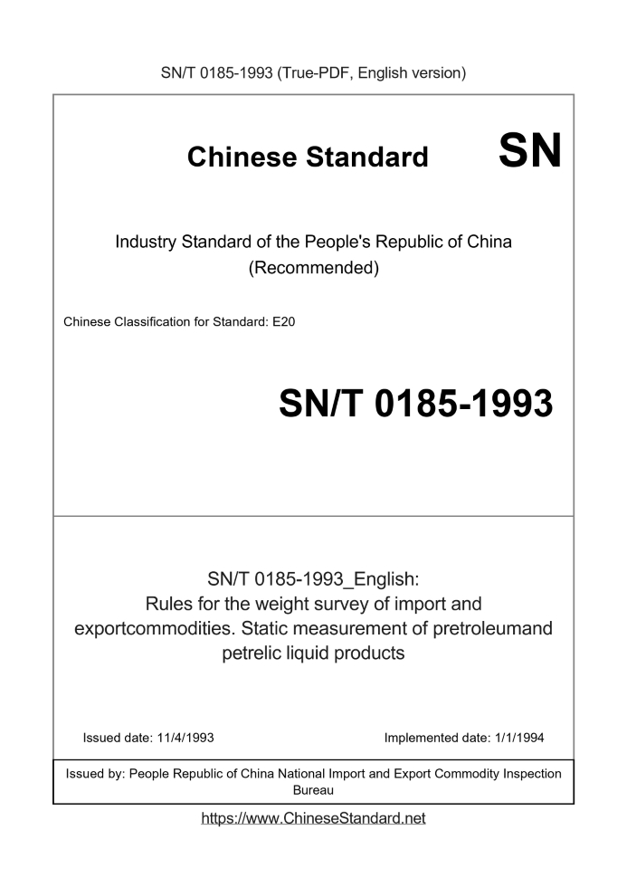 Delivery: <= 5 days. True-PDF full-copy in English will be manually translated and delivered via email. SN/T 0185-1993: Rules for the weight survey of import and exportcommodities. Static measurement of pretroleumand petrelic liquid products Status: Obsolete