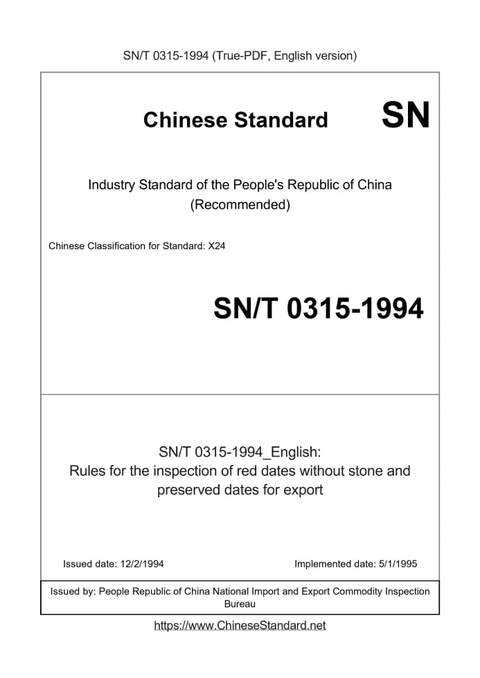 Delivery: <= 3 days. True-PDF full-copy in English will be manually translated and delivered via email. SN/T 0315-1994: Rules for the inspection of red dates without stone and preserved dates for export